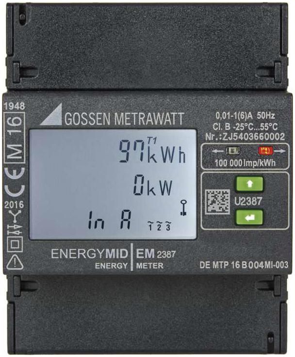 ENERGYMID EM2387-V012 - Multifunctional energy meter. The ENERGYMID EM energy meters offer maximum functionality at a low price. Thanks to a variety of interfaces, the meters can be easily integrated into existing systems. The new ENERGYMID energy meter generation opens up completely new cost-saving potential. The extremely small design with integrated interface gives you more space in the distributor or control cabinet for other required functions. Thanks to a wide range of interfaces, the calibrated ENERGYMID energy meters are your perfect solution for energy recording in industry, households, businesses and building technology - and all at a low price. Ultra-compact design 4 TE (72 mm) with integrated interface4 quadrant measurement: energy consumption and outputCommunication via pulse output Recording of THD for current and voltage as well as neutral conductor current IN4 tariffs. MORE SPACE-SAVINGFOR EVEN MORE FUNCTIONS IN YOUR DISTRIBUTION BOARD / CONTROL CABINETMore space in the distribution board thanks to the ultra-compact design with only 4 HP (72¿mm) space requirementIntegrated interface for connection to recording and optimization systemsProtection against contamination thanks to optimized housingIntegrated illuminated display for reading parameters and settingsTampering protection with sealable cover and parameter lockFASTER INSTALLEDFOR INSTALLATIONS THAT WORK RIGHT FROM THE STARTFaster installation thanks to error detection with color change on the displayEasy error detection by monitoring the installation parameters such as rotating field direction or reversed polarity convertersFast integration and programming thanks to sophisticated software toolsVaried, quick installation in any installation position on a 35 mm top hat railMORE COST-EFFECTIVELOW PURCHASE COSTS AND QUALITY MADE IN GERMANYLow acquisition costs thanks to Completely new design and optimized productionImmediately suitable for billing purposes thanks to initial calibration according to MID ex worksExtremely durable thanks to construction with the highest quality componentsManufactured in Germany according to the strictest quality criteria3 year guaranteeINTEGRATEDFOR FAST COMMUNICATION WITH A WIDE RANGE OF SYSTEMSFlexible communication and remote reading via integrated S0 interface. The calibrated energy meter can be used to record and bill active energy in industry, households, businesses and building technology. The values are transmitted to recording, billing and optimization systems as well as building automation and control technology via pulse output or bus interfaces.Energy recording in industry for individual lines or machinesMeasurement of renewable energy from photovoltaic and wind energy systemsRecording and billing of consumption at campsites, shopping centers, residential complexes, boat docksEnergy recording for hotels,Congress centers and trade fairsInternal cost distribution for timeshare apartments and sublet industrial buildingsConsumption billing in business centersSetting up energy recording systemsRemote transmission of consumption values and cost billing. Version for 3-wire networks 1 (6) A transformer connection ultra-compact housing 4 TE (72 mm) with integrated interface fast error detection through color change on the display (e.g. rotating field direction, phase failure, reversed polarity transformer or overload) accuracy class B for industry and commerce as well as increased requirements in households suitable for billing purposes thanks to initial calibration according to MID ex works (conformity assessment procedure module B+D) measurement of energy consumption and energy output thanks to 4 quadrant measurement cost-effective network monitoring by recording THD for current and voltage as well as neutral conductor current IN flexible communication via universal pulse output (2x S0 with adjustable pulse rate, duration) high-contrast three-line LC display (42 x 28 mm) with LED background lighting 4 tariffs tamper protection thanks to sealable cover