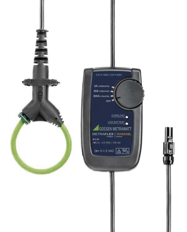 Flexible mini AC sensors METRAFLEX 300M XBL. With the micro Rogowski current sensor you can measure safely, precisely and flexibly on busbars as well as in power distribution. With the micro Rogowski current sensor you can measure safely, precisely and flexibly on busbars as well as in power distribution. The coil is particularly suitable for hard-to-reach and narrow places. The current sensor can be operated by an external power supply for long-term measurements. Wide range of applications, 3 measuring ranges 3 A/30 A/300 A AC and high bandwidth 20 Hz ... 100 kHz for power and network analysis Precise measurement even at low currents, thanks to large dynamic range and high sensor sensitivity Low influence of the conductor position and minimal external field influence Easy to use in confined spaces thanks to small sensor cross-section 6 mm Safe handling even with protective gloves, opening of the sensor and measuring range setting with one hand METRAFLEX 300MXBL: External supply for long-term measurement: - MAVOWATT 230/240/270/270-400: Supply via the MAVOWATT, no additional accessories required - MAVOWATT 20/30/40/70: DC/DC converter ISOFLEX-MHXL Current sensor with protection class