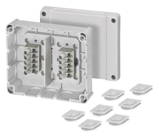 3 cable entries with 7 removable grommets DPS 2, with insertion partition wall and 2 5-pin terminal type: 2 x 5-pin. Terminal, 3 x 4, 4 x 2.5 or 6 x
