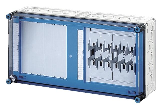 IP 65, Thermoplastic, gray RAL 7032, with transparent lid fasteners for tool operation, busbar systems 250 A, with contact protection, fuse bases. Size NH 00, 690 V AC, rated current 125 A.