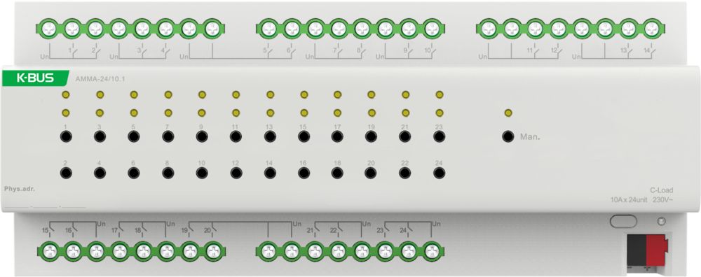 The device has up to 24 switching outputs / 12 blind outputs AC / 6 blind outputs DC (pole switching) / 6 fan outputs or 6 valve outputs. The outputs are configured via the parameters and can be individually adjusted.
