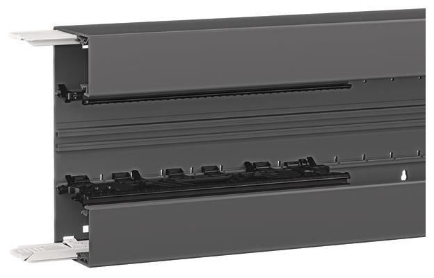 With bottom perforation (drill tolerance compensation on all sides) for direct wall mounting and additional rectangular perforation for tool-free fastening of the duct using clip technology on consoles. With front-locking, tool-free device installation for fastening devices and device installation boxes with quick fastening. Additional C-profile as device installation option. Couplings for simple and precise duct assembly, partition walls and cable retention clips available as accessories.