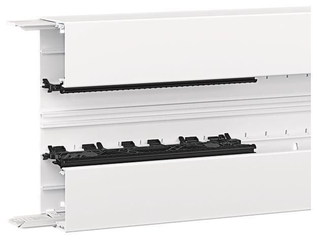 With bottom perforation (drill tolerance compensation on all sides) for direct wall mounting and additional rectangular perforation for tool-free fastening of the duct using clip technology on consoles. With front-locking, tool-free device installation for fastening devices and device installation boxes with quick fastening. Additional C-profile as device installation option. Couplings for simple and precise duct assembly, partition walls and cable retention clips available as accessories.