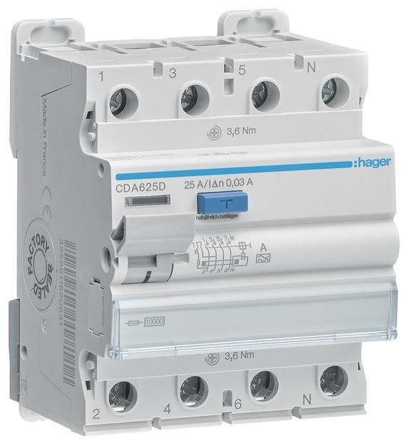 Hager CDA625D FI switch 4P 10kA 25A 30mA Type A