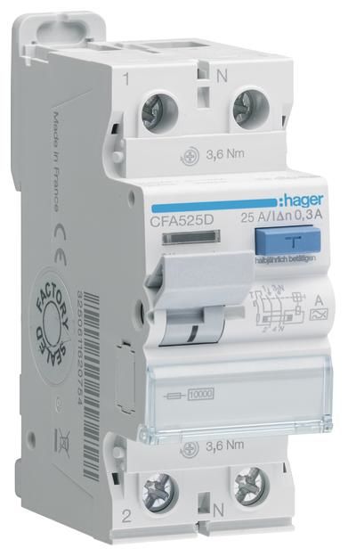 Hager CFA525D FI switch 2P 10kA 25 300mA Type A