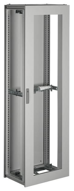 Cabinet frame made of galvanized sheet steel, cover plate and rear wall made of hot-dip galvanized sheet steel. With horizontal support rail for supporting rail stabilization, coupling plates for supporting rail fastening, prepared for univers N interior fitting system. Busbar bushings can be flanged next to each other through open side walls.