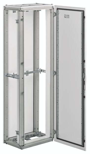 Cabinet frame made of glass-fiber reinforced plastic, cover plate and rear wall made of hot-dip galvanized sheet steel. With horizontal support rail for supporting rail stabilization, coupling plates for supporting rail fastening, prepared for univers N interior fitting system. Busbar bushing can be flanged next to each other through open side walls. Door made of sheet steel, powder-coated and baked, surface-mounted with internal hinges, can be hinged on the right or left. Door opening angle 120°, double door from width 1100 mm, door lock with standard four-point rod lock (single door) or 3-point rod lock (two doors) with 3 mm double bit.