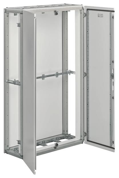 Cabinet frame made of glass-fiber reinforced plastic, cover plate and rear wall made of hot-dip galvanized sheet steel. With horizontal support rail for supporting rail stabilization, coupling plates for supporting rail fastening, prepared for univers N interior fitting system. Busbar bushing can be flanged next to each other through open side walls. Door made of sheet steel, powder-coated and baked, surface-mounted with internal hinges, can be hinged on the right or left. Door opening angle 120°, double door from width 1100 mm, door lock with standard four-point rod lock (single door) or 3-point rod lock (two doors) with 3 mm double bit.