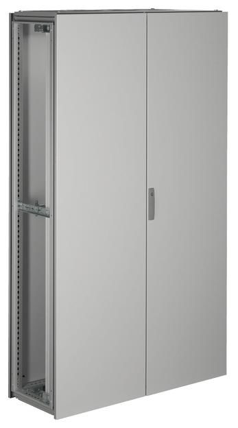 Door made of sheet steel, powder-coated and baked, surface-mounted with internal hinges, can be hinged on the right or left. Door opening angle 120°, double door from width 1100 mm, door lock with standard four-point rod lock (single door) or 3-point rod lock (two doors) with 3 mm double bit.