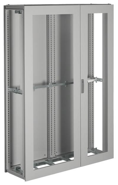 Cabinet frame made of galvanized sheet steel, cover plate and rear wall made of hot-dip galvanized sheet steel. With horizontal support rail for supporting rail stabilization, coupling plates for supporting rail fastening, prepared for univers N interior fitting system. Busbar bushings can be flanged next to each other through open side walls.