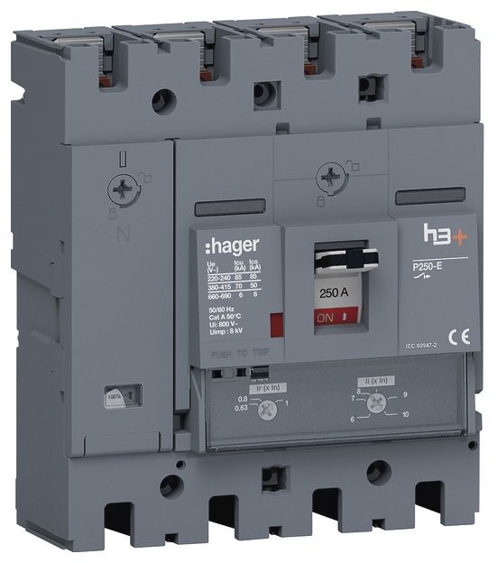 Hager HET251DR circuit breaker h3+ P250 TM ADJ 4P4D N0-100% 250A 70kA FTC