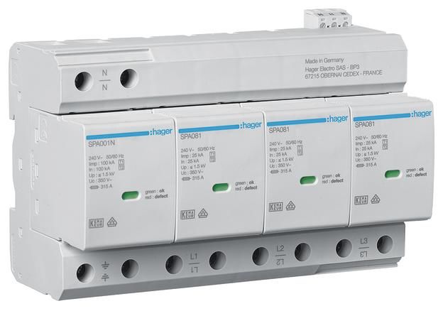 The article Hager SPA801 combination arrester T1+T2 4P Uc 350V Iimp 25kA Up 1.5kV TNS/TT is currently in stock
