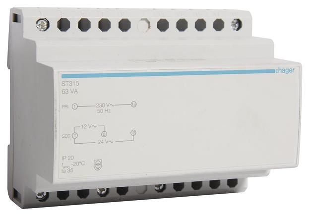 Hager built-in Transformer ST315, 230V/12-24V 5.25 / 2.63 A 60VA 6PLE