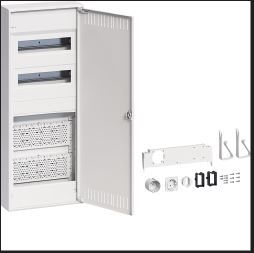 2-row device carrier made of galvanized sheet steel. 2-row device cover made of plastic for 24 (28) modules with 46 mm device slot. Finger-safe PE/N terminal with plug-in technology in an easy-to-install snap-in technology. A partition is installed to safely separate the multimedia part and the circuit distribution, which also allows for the accommodation of up to two sockets. Generous installation space with pre-assembled plastic mounting plate(s) with regular holes in accordance with DIN 24041. Device holders for screwless attachment of devices for direct mounting on the perforated plate by hanging or screwing are included.