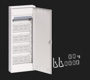 Upper connection compartment: patch panel and DIN top hat rail snapped on insulated to accommodate different communication modules, for the required functional equipotential bonding in accordance with DIN EN 50310 (VDE 0800-2-310) there are 2 screw fastenings on the patch panel. Labeling option with enclosed label strip for port labeling. Pre-assembled perforated mounting plates made of galvanized sheet steel with 3.2 mm holes are installed. A universal bracket can be hung directly on the perforated plate for screwless fastening of VDI components.