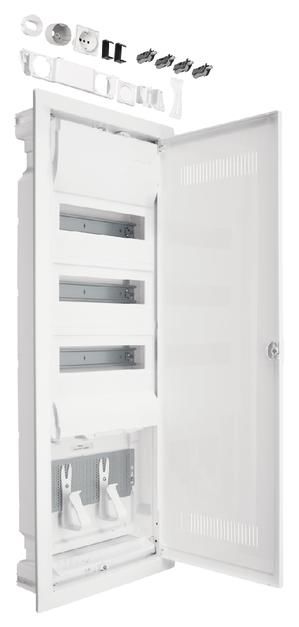 3-row device carrier made of galvanized sheet steel. 3-row device cover made of plastic for 36 (42) modules with 46 mm device slot, quick-release fastening with 90° rotation on the cable entry slide and on the partition, sealable on both sides as standard. Finger-safe PE/N terminal with plug-in technology in assembly-friendly snap technology. A partition is installed to safely separate the multimedia part and the circuit distribution, which at the same time also allows for the accommodation of up to two sockets. Generous installation space with pre-assembled mounting plate(s) made of galvanized sheet steel with 3.2 mm regular holes in accordance with DIN 24041. Device holders for screwless fastening of devices for direct mounting on the perforated sheet by hanging or screwing are included.