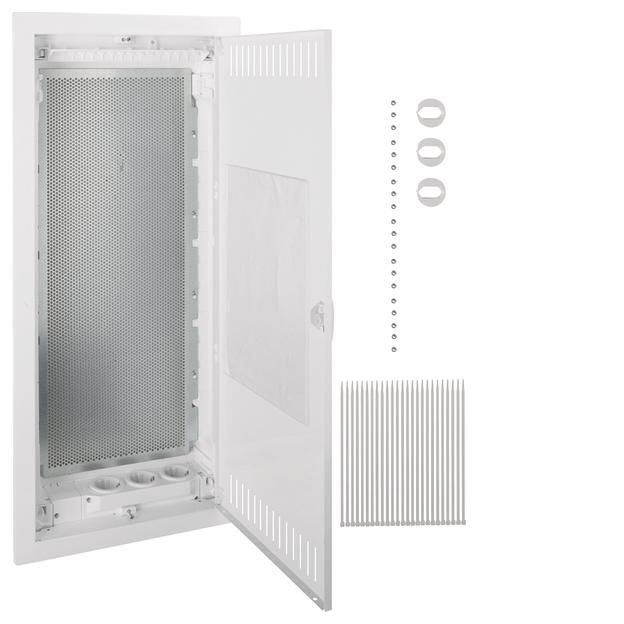 Consists of a plastic wall box with standard cable clamp and break-out cable entry slide with snap fastening and integrated spirit level, including galvanized sheet steel fastening tabs. Rotatable cover frame with ventilation door made of sheet steel, powder-coated and baked, with 15 mm plaster compensation. Ventilation door, flush with the front with internal, manually operated hinges. Door lock with flush-mounted recessed handle and automatically folding back handle. Door hinge on the right or left without dismantling the cover frame.