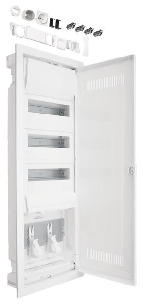 3-row device carrier made of galvanized sheet steel. 3-row device cover made of plastic for 36 (42) modules with 46 mm device slot, quick-release fastening with 90° rotation on the cable entry slide and on the partition, sealable on both sides as standard. Finger-safe PE/N terminal with plug-in technology in assembly-friendly snap technology. A partition is installed to safely separate the multimedia part and the circuit distribution, which at the same time also allows for the installation of up to two sockets. Generous installation space with pre-assembled mounting plate(s) made of galvanized sheet steel with 3.2 mm regular holes in accordance with DIN 24041. Device holders for screwless fastening of devices for direct mounting on the perforated sheet by hanging or screwing are included.