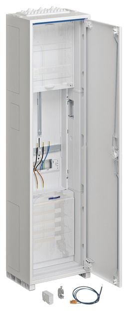 IP44, 1 field. Meter cabinet solution cabinet housing according to DIN VDE 0603/1, dimension standard DIN 43 870 for surface-mounted, flush-mounted or partially recessed installation. Consists of a cabinet with door made of powder-coated, baked-in, stably profiled 1 mm thick sheet steel. Interior lining made entirely of plastic. Cable entries at the top and bottom through built-in plastic flange plates. Rear pre-punching in the plastic part. Busbar bushings as flanges on both sides that can be opened without tools in the lower area as a possibility for busbar connection of different cabinets or in conjunction with a cable connection box and connection set. In addition to the bushing in the NAR, there are also openings in the area of the AAR (for heights 1100 and 1400 mm) and RfZ (for heights 1100 mm). Door flush with the front with internal, adjustable hinges, can be opened on the right or left with an opening angle of 110°. Door lock with cam lock. Door lock can be replaced with other locks. Cabinets can be flanged next to each other or one above the other. Cabinet size 1 to 5 fields with 72 to 540 space units (PLE). Note: The main line must be inserted into the lower connection compartment of the meter cabinet from below or from the side and connected there in accordance with VDE-AR-N 4100:2019-04. Height: __ mm (1100mm or 1400mm) Width: __ mm Depth: 205 / 160 mm, RAL color: 9010 Protection type 44, protection class II Nominal current of the busbar system 250 A Design in accordance with VDE-AR-N 4100:2019-04 Meter system for __ meter space(s). According to the technical connection conditions (TAB) of the VNB __ for: __ Electronic household meters (eHZ) or __ meters with 3-point fastening (3HZ). __ for supply systems with normal household consumption max. 63 A (10mm²) according to DIN 18015-1 (__ apartments, __ general, __ reserve, __ heat pump) __ for continuous current applications max. 32 A (10 mm²) according to VDE-AR-N 4100:2019-04 (e.g. PV up to 22 KW) __ for continuous current applications max. 44 A (16 mm²) according to VDE-AR-N 4100:2019-04 (e.g. PV up to 30 KW) __ for meter locations with more than 63 A in intermittent operation or 44 A in continuous operation (transformer measurement) Nominal current _ A, nominal power _ kW __ Tariff ripple control receiver as three-point version alternatively __ Tariff ripple control receiver as top-hat rail version __ Distribution panel (__ PLE), with/without busbars for feeding in __ Distribution panel (__ PLE) with APZ room according to VDE-AR-N 4100:2019-04, with/without busbars for feed-in __ Communication panel, 1- or 2-panel __ Communication panel with APZ room according to VDE-AR-N 4100:2019-04, with/without busbars for feed-in __ SLS switch Hager HTS3xxE in __ A.. Voltage tap for power supply additional devices according to VDE-AR-N 4100:2019-04: __ before the SLS with fuse box pluggable 25 kA __ before the SLS with LS switch 10 A / 25 kA __ behind the SLS with fuse box pluggable 25 kA. Surge protection with combination arrester type 1/2/3 for busbar mounting in the UAR.To comply with the requirements of DIN VDE 0100-443 and -534: ___for TNS/TT network, without external lightning protection, back-up fuse in the HAK - 160 A ___for TNC network, without external lightning protection, back-up fuse in the HAK - 160 A ___for TNS/TT network, with external lightning protection, back-up fuse in the HAK - 160 A ___for TNC network, with external lightning protection, back-up fuse in the HAK - 160 A ___for TNS/TT network, with external lightning protection, back-up fuse in the HAK - 315 A ___for TNC network, with external lightning protection, back-up fuse in the HAK - 315 A Fuse for cellar, washing machine, dryer (if TAB / DIN compliant) per WE (max. 6 PLE) __ pieces of FI/LS switch 10 kA, 16 A, 30 mA (ADA516D). General distribution panel equipped with: __ pcs. LS switch 6 kA, 16 A (MBS116) __ pcs. FI/LS switch 6 kA, 16 A, 30 mA (ADS916D) __ pcs. RCD type 40 A 4-pole, 30 mA (CDS440D). Consisting of: __ pcs. ZB__S, meter cabinet __ pcs. ZK__ Complete panel for __ meters __ selected make/type: HAGER/univers Z or equivalent, supply, install and make ready for operation.