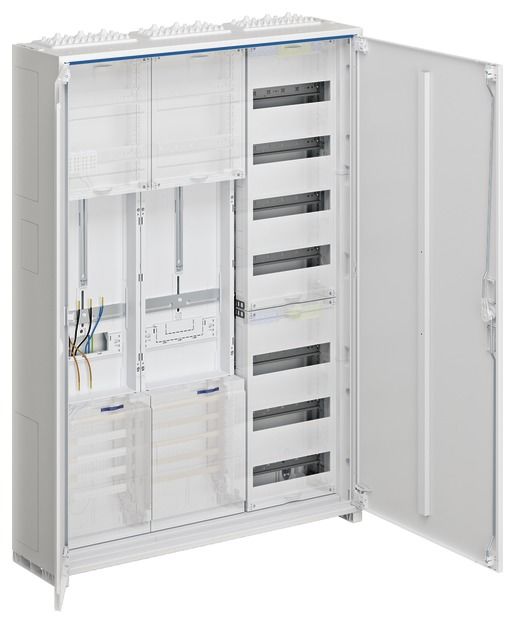 Complete cabinet, universal Z, 1 meter position, 1 SG, 3P., VT7, H=1100mm, 3-field. Meter cabinet solution cabinet housing according to DIN VDE 0603/1, dimensional standard DIN 43 870 for surface-mounted, flush-mounted or partially recessed installation. Consists of a cabinet with door made of powder-coated, baked-in, stably profiled 1 mm thick sheet steel. Interior lining made entirely of plastic. Cable entries at the top and bottom through built-in plastic flange plates. Back knockout in the plastic part. Busbar bushings as flanges on both sides that can be opened without tools in the lower area as a way of connecting busbars between different cabinets or in conjunction with a cable junction box and connection set. In addition to the bushing in the NAR, there are also openings in the area of the AAR (for heights of 1100 and 1400 mm) and RfZ (for heights of 1100 mm). Door flush with the front with internal, adjustable hinges, can be opened on the right or left with an opening angle of 110°. Door lock with cam lock. Door lock can be replaced with other locks. Cabinets can be flanged next to each other or one above the other. Cabinet size 1 to 5 fields with 72 to 540 space units (PLE). Note: The main line must be inserted into the lower connection compartment of the meter cabinet from below or from the side and connected there in accordance with VDE-AR-N 4100:2019-04. Height: __ mm (1100mm or 1400mm) Width: __ mm Depth: 205 / 160 mm, RAL color: 9010 Protection type 44, protection class II Nominal current of the busbar system 250 A Design in accordance with VDE-AR-N 4100:2019-04 Meter system for __ meter space(s). According to the technical connection conditions (TAB) of the VNB __ for: __ Electronic household meters (eHZ) or __ meters with 3-point fastening (3HZ). __ for supply systems with normal household consumption max. 63 A (10mm²) according to DIN 18015-1 (__ apartments, __ general, __ reserve, __ heat pump) __ for continuous current applications max. 32 A (10 mm²) according to VDE-AR-N 4100:2019-04 (e.g. PV up to 22 KW) __ for continuous current applications max. 44 A (16 mm²) according to VDE-AR-N 4100:2019-04 (e.g. PV up to 30 KW) __ for meter locations with more than 63 A in intermittent operation or 44 A in continuous operation (transformer measurement) Nominal current _ A, nominal power _ kW __ Tariff ripple control receiver as three-point version alternatively __ Tariff ripple control receiver as top-hat rail version __ Distribution panel (__ PLE), with/without busbars for feeding in __ Distribution panel (__ PLE) with APZ room according to VDE-AR-N 4100:2019-04, with/without busbars for feed-in __ Communication panel, 1- or 2-panel __ Communication panel with APZ room according to VDE-AR-N 4100:2019-04, with/without busbars for feed-in __ SLS switch Hager HTS3xxE in __ A.. Voltage tap for power supply additional devices according to VDE-AR-N 4100:2019-04: __ before the SLS with fuse box pluggable 25 kA __ before the SLS with LS switch 10 A / 25 kA __ behind the SLS with fuse box pluggable 25 kA. Surge protection with combination arrester type 1/2/3 for busbar mounting in the UAR.To comply with the requirements of DIN VDE 0100-443 and -534: ___for TNS/TT network, without external lightning protection, back-up fuse in the HAK - 160 A ___for TNC network, without external lightning protection, back-up fuse in the HAK - 160 A ___for TNS/TT network, with external lightning protection, back-up fuse in the HAK - 160 A ___for TNC network, with external lightning protection, back-up fuse in the HAK - 160 A ___for TNS/TT network, with external lightning protection, back-up fuse in the HAK - 315 A ___for TNC network, with external lightning protection, back-up fuse in the HAK - 315 A Fuse for cellar, washing machine, dryer (if TAB / DIN compliant) per WE (max. 6 PLE) __ pieces of FI/LS switch 10 kA, 16 A, 30 mA (ADA516D). General distribution panel equipped with: __ pcs. LS switch 6 kA, 16 A (MBS116) __ pcs. FI/LS switch 6 kA, 16 A, 30 mA (ADS916D) __ pcs. RCD type 40 A 4-pole, 30 mA (CDS440D). Consisting of: __ pcs. ZB__S, meter cabinet __ pcs. ZK__ Complete panel for __ meters __ selected make/type: HAGER/univers Z or equivalent, supply, assemble and connect ready for operation.