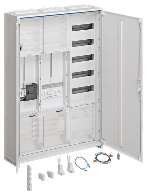 Complete cabinet, universal Z, 1ZP, 3P., 1SG, APZ, VT5, H = 1100 mm, 3-field, ZSK, ESA, ZY405MS. Meter cabinet solution cabinet housing according to DIN VDE 0603/1, dimensional standard DIN 43 870 for surface-mounted, flush-mounted or partially recessed installation. Consists of a cabinet with door made of powder-coated, baked-in, stably profiled 1 mm thick sheet steel. Interior lining made entirely of plastic. Cable entries at the top and bottom through built-in plastic flange plates. Pre-punched part on the back of the plastic part. Busbar bushings as flanges on both sides that can be opened without tools in the lower area as a way of connecting busbars between different cabinets or in conjunction with a cable junction box and connection set. In addition to the bushing in the NAR, there are also openings in the area of the AAR (for heights of 1100 and 1400 mm) and RfZ (for heights of 1100 mm). Door flush with the front with internal, adjustable hinges, can be opened on the right or left with an opening angle of 110°. Door lock with cam lock. Door lock can be replaced with other locks. Cabinets can be flanged next to each other or one above the other. Cabinet size 1 to 5 fields with 72 to 540 space units (PLE). Note: The main line must be inserted into the lower connection compartment of the meter cabinet from below or from the side and connected there in accordance with VDE-AR-N 4100:2019-04. Height: __ mm (1100mm or 1400mm) Width: __ mm Depth: 205 / 160 mm, RAL color: 9010 Protection type 44, protection class II Nominal current of the busbar system 250 A Design in accordance with VDE-AR-N 4100:2019-04 Meter system for __ meter space(s). According to the technical connection conditions (TAB) of the VNB __ for: __ Electronic household meters (eHZ) or __ meters with 3-point fastening (3HZ). __ for supply systems with normal household consumption max. 63 A (10mm²) according to DIN 18015-1 (__ apartments, __ general, __ reserve, __ heat pump) __ for continuous current applications max. 32 A (10 mm²) according to VDE-AR-N 4100:2019-04 (e.g. PV up to 22 KW) __ for continuous current applications max. 44 A (16 mm²) according to VDE-AR-N 4100:2019-04 (e.g. PV up to 30 KW) __ for meter locations with more than 63 A in intermittent operation or 44 A in continuous operation (transformer measurement) Nominal current _ A, nominal power _ kW __ Tariff ripple control receiver as three-point version alternatively __ Tariff ripple control receiver as top-hat rail version __ Distribution panel (__ PLE), with/without busbars for feeding in __ Distribution panel (__ PLE) with APZ room according to VDE-AR-N 4100:2019-04, with/without busbars for feed-in __ Communication panel, 1- or 2-panel __ Communication panel with APZ room according to VDE-AR-N 4100:2019-04, with/without busbars for feed-in __ SLS switch Hager HTS3xxE in __ A.. Voltage tap for power supply additional devices according to VDE-AR-N 4100:2019-04: __ before the SLS with fuse box pluggable 25 kA __ before the SLS with LS switch 10 A / 25 kA __ behind the SLS with fuse box pluggable 25 kA. Surge protection with combination arrester type 1/2/3 for busbar mounting in the UAR.To comply with the requirements of DIN VDE 0100-443 and -534: ___for TNS/TT network, without external lightning protection, back-up fuse in the HAK - 160 A ___for TNC network, without external lightning protection, back-up fuse in the HAK - 160 A ___for TNS/TT network, with external lightning protection, back-up fuse in the HAK - 160 A ___for TNC network, with external lightning protection, back-up fuse in the HAK - 160 A ___for TNS/TT network, with external lightning protection, back-up fuse in the HAK - 315 A ___for TNC network, with external lightning protection, back-up fuse in the HAK - 315 A Fuse for cellar, washing machine, dryer (if TAB / DIN compliant) per WE (max. 6 PLE) __ pieces of FI/LS switch 10 kA, 16 A, 30 mA (ADA516D). General distribution panel equipped with: __ pcs. LS switch 6 kA, 16 A (MBS116) __ pcs. FI/LS switch 6 kA, 16 A, 30 mA (ADS916D) __ pcs. RCD type 40 A 4-pole, 30 mA (CDS440D). Consisting of: __ pcs. ZB__S, meter cabinet __ pcs. ZK__ Complete panel for __ meters __ selected make/type: HAGER/univers Z or equivalent, supply, install and ready for operation