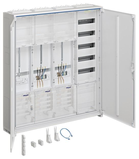 Complete cabinet, universal Z, 2 meter panels, 1 SG, 3P, APZ, VT5, H=1100mm, 4-field, ESA. Meter cabinet solution cabinet housing in accordance with DIN VDE 0603/1, dimensional standard DIN 43 870 for surface-mounted, flush-mounted or partially recessed installation. Consists of a cabinet with a door made of powder-coated, baked-in, sturdily profiled 1 mm thick sheet steel. Interior lining made entirely of plastic. Cable entries at the top and bottom through built-in plastic flange plates. Back knockout in the plastic part. Busbar bushings as flanges on both sides that can be opened without tools in the lower area as a way of connecting busbars between different cabinets or in conjunction with a cable junction box and connection set. In addition to the bushing in the NAR, there are also openings in the area of the AAR (for heights of 1100 and 1400 mm) and RfZ (for heights of 1100 mm). Door flush with the front with internal, adjustable hinges, can be opened on the right or left with an opening angle of 110°. Door lock with cam lock. Door lock can be replaced with other locks. Cabinets can be flanged next to each other or one above the other. Cabinet size 1 to 5 fields with 72 to 540 space units (PLE). Note: The main line must be inserted into the lower connection compartment of the meter cabinet from below or from the side and connected there in accordance with VDE-AR-N 4100:2019-04. Height: __ mm (1100mm or 1400mm) Width: __ mm Depth: 205 / 160 mm, RAL color: 9010 Protection type 44, protection class II Nominal current of the busbar system 250 A Design in accordance with VDE-AR-N 4100:2019-04 Meter system for __ meter space(s). According to the technical connection conditions (TAB) of the VNB __ for: __ Electronic household meters (eHZ) or __ meters with 3-point fastening (3HZ). __ for supply systems with normal household consumption max. 63 A (10mm²) according to DIN 18015-1 (__ apartments, __ general, __ reserve, __ heat pump) __ for continuous current applications max. 32 A (10 mm²) according to VDE-AR-N 4100:2019-04 (e.g. PV up to 22 KW) __ for continuous current applications max. 44 A (16 mm²) according to VDE-AR-N 4100:2019-04 (e.g. PV up to 30 KW) __ for meter locations with more than 63 A in intermittent operation or 44 A in continuous operation (transformer measurement) Nominal current _ A, nominal power _ kW __ Tariff ripple control receiver as three-point version alternatively __ Tariff ripple control receiver as top-hat rail version __ Distribution panel (__ PLE), with/without busbars for feeding in __ Distribution panel (__ PLE) with APZ room according to VDE-AR-N 4100:2019-04, with/without busbars for feed-in __ Communication panel, 1- or 2-panel __ Communication panel with APZ room according to VDE-AR-N 4100:2019-04, with/without busbars for feed-in __ SLS switch Hager HTS3xxE in __ A.. Voltage tap for power supply additional devices according to VDE-AR-N 4100:2019-04: __ before the SLS with fuse box pluggable 25 kA __ before the SLS with LS switch 10 A / 25 kA __ behind the SLS with fuse box pluggable 25 kA. Surge protection with combination arrester type 1/2/3 for busbar mounting in the UAR.To comply with the requirements of DIN VDE 0100-443 and -534: ___for TNS/TT network, without external lightning protection, back-up fuse in the HAK - 160 A ___for TNC network, without external lightning protection, back-up fuse in the HAK - 160 A ___for TNS/TT network, with external lightning protection, back-up fuse in the HAK - 160 A ___for TNC network, with external lightning protection, back-up fuse in the HAK - 160 A ___for TNS/TT network, with external lightning protection, back-up fuse in the HAK - 315 A ___for TNC network, with external lightning protection, back-up fuse in the HAK - 315 A Fuse for cellar, washing machine, dryer (if TAB / DIN compliant) per WE (max. 6 PLE) __ pieces of FI/LS switch 10 kA, 16 A, 30 mA (ADA516D). General distribution panel equipped with: __ pcs. LS switch 6 kA, 16 A (MBS116) __ pcs. FI/LS switch 6 kA, 16 A, 30 mA (ADS916D) __ pcs. RCD type 40 A 4-pole, 30 mA (CDS440D). Consisting of: __ pcs. ZB__S, meter cabinet __ pcs. ZK__ Complete panel for __ meters __ selected make/type: HAGER/univers Z or equivalent, deliver, assemble and ready for use to