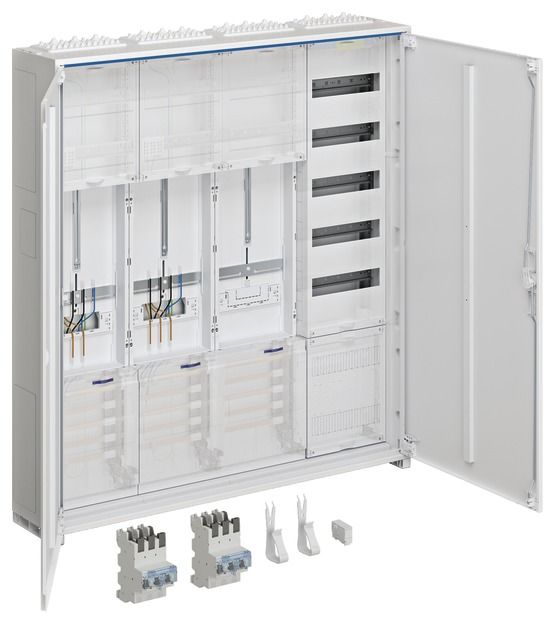 IP44. Meter cabinet solution cabinet housing according to DIN VDE 0603/1, dimensional standard DIN 43 870 for surface-mounted, flush-mounted or partially recessed installation. Consists of a cabinet with door made of powder-coated, baked-in, stably profiled 1 mm thick sheet steel. Interior lining made entirely of plastic. Cable entries at the top and bottom through built-in plastic flange plates. Pre-punched part on the back of the plastic part. Busbar bushings as flanges on both sides that can be opened without tools in the lower area as a way of connecting busbars between different cabinets or in conjunction with a cable junction box and connection set. In addition to the bushing in the NAR, there are also openings in the area of the AAR (for heights of 1100 and 1400 mm) and RfZ (for heights of 1100 mm). Door flush with the front with internal, adjustable hinges, can be opened on the right or left with an opening angle of 110°. Door lock with cam lock. Door lock can be replaced with other locks. Cabinets can be flanged next to each other or one above the other. Cabinet size 1 to 5 fields with 72 to 540 space units (PLE). Note: The main line must be inserted into the lower connection compartment of the meter cabinet from below or from the side and connected there in accordance with VDE-AR-N 4100:2019-04. Height: __ mm (1100mm or 1400mm) Width: __ mm Depth: 205 / 160 mm, RAL color: 9010 Protection type 44, protection class II Nominal current of the busbar system 250 A Design in accordance with VDE-AR-N 4100:2019-04 Meter system for __ meter space(s). According to the technical connection conditions (TAB) of the VNB __ for: __ Electronic household meters (eHZ) or __ meters with 3-point fastening (3HZ). __ for supply systems with normal household consumption max. 63 A (10mm²) according to DIN 18015-1 (__ apartments, __ general, __ reserve, __ heat pump) __ for continuous current applications max. 32 A (10 mm²) according to VDE-AR-N 4100:2019-04 (e.g. PV up to 22 KW) __ for continuous current applications max. 44 A (16 mm²) according to VDE-AR-N 4100:2019-04 (e.g. PV up to 30 KW) __ for meter locations with more than 63 A in intermittent operation or 44 A in continuous operation (transformer measurement) Nominal current _ A, nominal power _ kW __ Tariff ripple control receiver as three-point version alternatively __ Tariff ripple control receiver as top-hat rail version __ Distribution panel (__ PLE), with/without busbars for feeding in __ Distribution panel (__ PLE) with APZ room according to VDE-AR-N 4100:2019-04, with/without busbars for feed-in __ Communication panel, 1- or 2-panel __ Communication panel with APZ room according to VDE-AR-N 4100:2019-04, with/without busbars for feed-in __ SLS switch Hager HTS3xxE in __ A.. Voltage tap for power supply additional devices according to VDE-AR-N 4100:2019-04: __ before the SLS with fuse box pluggable 25 kA __ before the SLS with LS switch 10 A / 25 kA __ behind the SLS with fuse box pluggable 25 kA. Surge protection with combination arrester type 1/2/3 for busbar mounting in the UAR.To comply with the requirements of DIN VDE 0100-443 and -534: ___for TNS/TT network, without external lightning protection, back-up fuse in the HAK - 160 A ___for TNC network, without external lightning protection, back-up fuse in the HAK - 160 A ___for TNS/TT network, with external lightning protection, back-up fuse in the HAK - 160 A ___for TNC network, with external lightning protection, back-up fuse in the HAK - 160 A ___for TNS/TT network, with external lightning protection, back-up fuse in the HAK - 315 A ___for TNC network, with external lightning protection, back-up fuse in the HAK - 315 A Fuse for cellar, washing machine, dryer (if TAB / DIN compliant) per WE (max. 6 PLE) __ pieces of FI/LS switch 10 kA, 16 A, 30 mA (ADA516D). General distribution panel equipped with: __ pcs. LS switch 6 kA, 16 A (MBS116) __ pcs. FI/LS switch 6 kA, 16 A, 30 mA (ADS916D) __ pcs. RCD type 40 A 4-pole, 30 mA (CDS440D). Consisting of: __ pcs. ZB__S, meter cabinet __ pcs. ZK__ Complete panel for __ meters __ selected make/type: HAGER/univers Z or equivalent, supply, assemble and connect ready for use.
