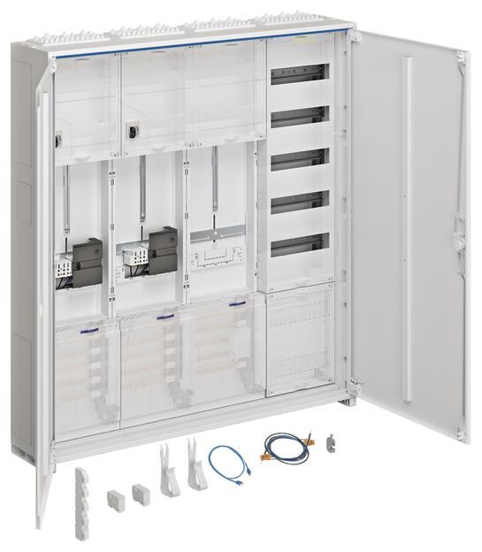 Complete cabinet, universal Z, 2ZP, 3P., 1SG, APZ, VT5, H = 1100 mm, 4-field, ZSK, ESA, ZY405MS. Meter cabinet solution cabinet housing according to DIN VDE 0603/1, dimensional standard DIN 43 870 for surface-mounted, flush-mounted or partially recessed installation. Consists of a cabinet with door made of powder-coated, baked-in, stably profiled 1 mm thick sheet steel. Interior lining made entirely of plastic. Cable entries at the top and bottom through built-in plastic flange plates. Pre-punched part on the back of the plastic part. Busbar bushings as flanges on both sides that can be opened without tools in the lower area as a way of connecting busbars between different cabinets or in conjunction with a cable junction box and connection set. In addition to the bushing in the NAR, there are also openings in the area of the AAR (for heights of 1100 and 1400 mm) and RfZ (for heights of 1100 mm). Door flush with the front with internal, adjustable hinges, can be opened on the right or left with an opening angle of 110°. Door lock with cam lock. Door lock can be replaced with other locks. Cabinets can be flanged next to each other or one above the other. Cabinet size 1 to 5 fields with 72 to 540 space units (PLE). Note: The main line must be inserted into the lower connection compartment of the meter cabinet from below or from the side and connected there in accordance with VDE-AR-N 4100:2019-04. Height: __ mm (1100mm or 1400mm) Width: __ mm Depth: 205 / 160 mm, RAL color: 9010 Protection type 44, protection class II Nominal current of the busbar system 250 A Design in accordance with VDE-AR-N 4100:2019-04 Meter system for __ meter space(s). According to the technical connection conditions (TAB) of the VNB __ for: __ Electronic household meters (eHZ) or __ meters with 3-point fastening (3HZ). __ for supply systems with normal household consumption max. 63 A (10mm²) according to DIN 18015-1 (__ apartments, __ general, __ reserve, __ heat pump) __ for continuous current applications max. 32 A (10 mm²) according to VDE-AR-N 4100:2019-04 (e.g. PV up to 22 KW) __ for continuous current applications max. 44 A (16 mm²) according to VDE-AR-N 4100:2019-04 (e.g. PV up to 30 KW) __ for meter locations with more than 63 A in intermittent operation or 44 A in continuous operation (transformer measurement) Nominal current _ A, nominal power _ kW __ Tariff ripple control receiver as three-point version alternatively __ Tariff ripple control receiver as top-hat rail version __ Distribution panel (__ PLE), with/without busbars for feeding in __ Distribution panel (__ PLE) with APZ room according to VDE-AR-N 4100:2019-04, with/without busbars for feed-in __ Communication panel, 1- or 2-panel __ Communication panel with APZ room according to VDE-AR-N 4100:2019-04, with/without busbars for feed-in __ SLS switch Hager HTS3xxE in __ A.. Voltage tap for power supply additional devices according to VDE-AR-N 4100:2019-04: __ before the SLS with fuse box pluggable 25 kA __ before the SLS with LS switch 10 A / 25 kA __ behind the SLS with fuse box pluggable 25 kA. Surge protection with combination arrester type 1/2/3 for busbar mounting in the UAR.To comply with the requirements of DIN VDE 0100-443 and -534: ___for TNS/TT network, without external lightning protection, back-up fuse in the HAK - 160 A ___for TNC network, without external lightning protection, back-up fuse in the HAK - 160 A ___for TNS/TT network, with external lightning protection, back-up fuse in the HAK - 160 A ___for TNC network, with external lightning protection, back-up fuse in the HAK - 160 A ___for TNS/TT network, with external lightning protection, back-up fuse in the HAK - 315 A ___for TNC network, with external lightning protection, back-up fuse in the HAK - 315 A Fuse for cellar, washing machine, dryer (if TAB / DIN compliant) per WE (max. 6 PLE) __ pieces of FI/LS switch 10 kA, 16 A, 30 mA (ADA516D). General distribution panel equipped with: __ pcs. LS switch 6 kA, 16 A (MBS116) __ pcs. FI/LS switch 6 kA, 16 A, 30 mA (ADS916D) __ pcs. RCD type 40 A 4-pole, 30 mA (CDS440D). Consisting of: __ pcs. ZB__S, meter cabinet __ pcs. ZK__ Complete panel for __ meters __ selected make/type: HAGER/univers Z or equivalent, supply, install and ready for operation