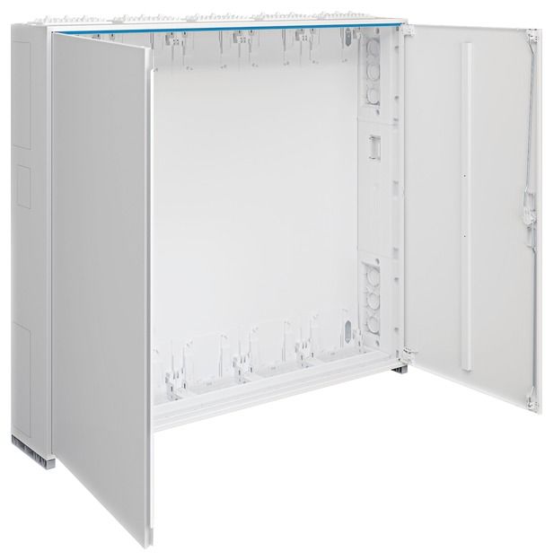 Door flush with the front with internal, adjustable hinges, can be opened either on the right or left with an opening angle of 110°. Door lock with sash, from a width of 800 mm and for all cabinets from a height of 1250 mm with a rod lock with three-point locking. Door lock can be replaced with other locks. Cabinets can be flanged next to each other and on top of each other. Cabinet size 1 to 5 fields with 72 to 540 space units (PLE).