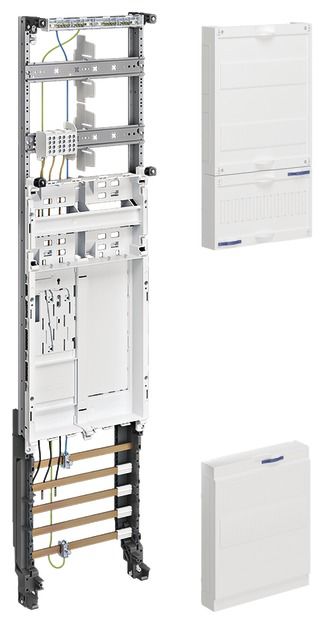 Upper connection compartment: 1-row, height 150 mm with one top hat rail, 2-row, height 300 mm with two top hat rails, equipped with 3-/4- or 5-pole main line branch terminals, finger-safe in accordance with BGVA3 or equipped with __________ __________ ___________ -meter fields with integrated fastening and contacting device (BKE-I) for eHZ, for installation in accordance with DIN 43870, eHZ meter support plate with integrated additional space (for communication and control devices).