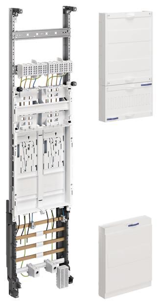 Upper connection compartment: 1-row, height 150 mm with one top hat rail, 2-row, height 300 mm with two top hat rails, equipped with 3-/4- or 5-pole main line branch terminals, finger-safe in accordance with BGVA3 or equipped with __________ __________ ___________ -meter fields with integrated fastening and contacting device (BKE-I) for eHZ, for installation in accordance with DIN 43870, eHZ meter support plate with integrated additional space (for communication and control devices).