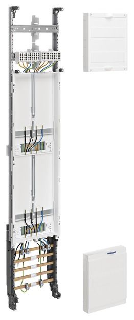 Complete panel, universZ, 1350mm, 2ZP, 1-panel, Central Germany design. Meter cabinet solution cabinet housing according to DIN VDE 0603/1, dimensional standard DIN 43 870 for surface-mounted, flush-mounted or partially recessed installation. Consists of a cabinet with door made of powder-coated, baked-on, stably profiled 1 mm thick sheet steel. Interior lining made entirely of plastic. Cable entries at the top and bottom through built-in plastic flange plates. Back knockout in the plastic part. Busbar bushings as flanges on both sides that can be opened without tools in the lower area as a way of connecting busbars between different cabinets or in conjunction with a cable junction box and connection set. In addition to the bushing in the NAR, there are also openings in the area of the AAR (for heights 1100 and 1400 mm) and RfZ (for heights 1100 mm). Door flush with the front with internal, adjustable hinges, can be opened on the right or left with an opening angle of 110°. Door lock with cam lock. Door lock can be replaced with other locks. Cabinets can be flanged next to each other or one above the other. Cabinet size 1 to 5 fields with 72 to 540 space units (PLE). Note: The main line must be inserted into the lower connection compartment of the meter cabinet from below or from the side and connected there in accordance with VDE-AR-N 4100:2019-04. Height: __ mm (1100mm or 1400mm) Width: __ mm Depth: 205 / 160 mm, RAL color: 9010 Protection type 44, protection class II Nominal current of the busbar system 250 A Design in accordance with VDE-AR-N 4100:2019-04 Meter system for __ meter space(s). According to the technical connection conditions (TAB) of the VNB __ for: __ Electronic household meters (eHZ) or __ meters with 3-point fastening (3HZ). __ for supply systems with normal household consumption max. 63 A (10mm²) according to DIN 18015-1 (__ apartments, __ general, __ reserve, __ heat pump) __ for continuous current applications max. 32 A (10 mm²) according to VDE-AR-N 4100:2019-04 (e.g. PV up to 22 KW) __ for continuous current applications max. 44 A (16 mm²) according to VDE-AR-N 4100:2019-04 (e.g. PV up to 30 KW) __ for meter locations with more than 63 A in intermittent operation or 44 A in continuous operation (transformer measurement) Nominal current _ A, nominal power _ kW __ Tariff ripple control receiver as three-point version alternatively __ Tariff ripple control receiver as top-hat rail version __ Distribution panel (__ PLE), with/without busbars for feeding in __ Distribution panel (__ PLE) with APZ room according to VDE-AR-N 4100:2019-04, with/without busbars for feed-in __ Communication panel, 1- or 2-panel __ Communication panel with APZ room according to VDE-AR-N 4100:2019-04, with/without busbars for feed-in __ SLS switch Hager HTS3xxE in __ A.. Voltage tap for power supply additional devices according to VDE-AR-N 4100:2019-04: __ before the SLS with fuse box pluggable 25 kA __ before the SLS with LS switch 10 A / 25 kA __ behind the SLS with fuse box pluggable 25 kA. Surge protection with combination arrester type 1/2/3 for busbar mounting in the UAR.To comply with the requirements of DIN VDE 0100-443 and -534: ___for TNS/TT network, without external lightning protection, back-up fuse in the HAK - 160 A ___for TNC network, without external lightning protection, back-up fuse in the HAK - 160 A ___for TNS/TT network, with external lightning protection, back-up fuse in the HAK - 160 A ___for TNC network, with external lightning protection, back-up fuse in the HAK - 160 A ___for TNS/TT network, with external lightning protection, back-up fuse in the HAK - 315 A ___for TNC network, with external lightning protection, back-up fuse in the HAK - 315 A Fuse for cellar, washing machine, dryer (if TAB / DIN compliant) per WE (max. 6 PLE) __ pieces of FI/LS switch 10 kA, 16 A, 30 mA (ADA516D). General distribution panel equipped with: __ pcs. LS switch 6 kA, 16 A (MBS116) __ pcs. FI/LS switch 6 kA, 16 A, 30 mA (ADS916D) __ pcs. RCD type 40 A 4-pole, 30 mA (CDS440D). Consisting of: __ pcs. ZB__S, meter cabinet __ pcs. ZK__ Complete panel for __ meters __ selected make/type: HAGER/univers Z or equivalent, supply, assemble and connect ready for operation