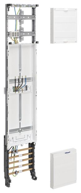 System-side connection compartment: Height 300 mm, 2-row with top-hat rails equipped with main line branch terminals in accordance with DIN VDE 0603-3-1, 3- or 5-pole, finger-safe in accordance with DGUV Regulation 3 or equipped with: __________ __________ ___________ -Meter fields with integrated fastening and contacting device (BKE-I) for eHZ for installation of eHZ meter support plates in accordance with DIN VDE 0603-3-2 with integrated additional space (for communication and control devices).