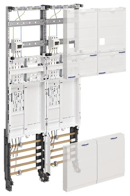 Complete panel, universal Z, 2 meter spaces, BKE-I, main switch, H=1050mm2-panel. Meter cabinet solution cabinet housing according to DIN VDE 0603/1, dimension standard DIN 43 870 for surface-mounted, flush-mounted or partially recessed installation. Consists of a cabinet with door made of powder-coated, baked-in, stably profiled 1mm thick sheet steel. Interior lining made entirely of plastic. Cable entries at the top and bottom through built-in plastic flange plates. Rear pre-punching in the plastic part. Busbar bushings as flanges on both sides that can be opened without tools in the lower area as a way of connecting busbars between different cabinets or in conjunction with a cable junction box and connection set. In addition to the bushing in the NAR, there are also openings in the area of the AAR (for heights of 1100 and 1400 mm) and RfZ (for heights of 1100mm). Door flush with the front with internal, adjustable hinges, can be opened on the right or left with an opening angle of 110°. Door lock with cam lock. Door lock can be replaced with other locks. Cabinets can be flanged next to each other or one above the other. Cabinet size 1 to 5 fields with 72 to 540 space units (PLE). Note: The main line must be inserted into the lower connection compartment of the meter cabinet from below or from the side and connected there in accordance with VDE-AR-N 4100:2019-04. Height: __ mm (1100mm or 1400mm) Width: __ mm Depth: 205 / 160 mm, RAL color: 9010 Protection type 44, protection class II Nominal current of the busbar system 250 A Design in accordance with VDE-AR-N 4100:2019-04 Meter system for __ meter space(s). According to the technical connection conditions (TAB) of the VNB __ for: __ Electronic household meters (eHZ) or __ meters with 3-point fastening (3HZ). __ for supply systems with normal household consumption max. 63 A (10mm²) according to DIN 18015-1 (__ apartments, __ general, __ reserve, __ heat pump) __ for continuous current applications max. 32 A (10 mm²) according to VDE-AR-N 4100:2019-04 (e.g. PV up to 22 KW) __ for continuous current applications max. 44 A (16 mm²) according to VDE-AR-N 4100:2019-04 (e.g. PV up to 30 KW) __ for meter locations with more than 63 A in intermittent operation or 44 A in continuous operation (transformer measurement) Nominal current _ A, nominal power _ kW __ Tariff ripple control receiver as three-point version alternatively __ Tariff ripple control receiver as top-hat rail version __ Distribution panel (__ PLE), with/without busbars for feeding in __ Distribution panel (__ PLE) with APZ room according to VDE-AR-N 4100:2019-04, with/without busbars for feed-in __ Communication panel, 1- or 2-panel __ Communication panel with APZ room according to VDE-AR-N 4100:2019-04, with/without busbars for feed-in __ SLS switch Hager HTS3xxE in __ A.. Voltage tap for power supply additional devices according to VDE-AR-N 4100:2019-04: __ before the SLS with fuse box pluggable 25 kA __ before the SLS with LS switch 10 A / 25 kA __ behind the SLS with fuse box pluggable 25 kA. Surge protection with combination arrester type 1/2/3 for busbar mounting in the UAR.To comply with the requirements of DIN VDE 0100-443 and -534: ___for TNS/TT network, without external lightning protection, back-up fuse in the HAK - 160 A ___for TNC network, without external lightning protection, back-up fuse in the HAK - 160 A ___for TNS/TT network, with external lightning protection, back-up fuse in the HAK - 160 A ___for TNC network, with external lightning protection, back-up fuse in the HAK - 160 A ___for TNS/TT network, with external lightning protection, back-up fuse in the HAK - 315 A ___for TNC network, with external lightning protection, back-up fuse in the HAK - 315 A Fuse for cellar, washing machine, dryer (if TAB / DIN compliant) per WE (max. 6 PLE) __ pieces of FI/LS switch 10 kA, 16 A, 30 mA (ADA516D). General distribution panel equipped with: __ pcs. LS switch 6 kA, 16 A (MBS116) __ pcs. FI/LS switch 6 kA, 16 A, 30 mA (ADS916D) __ pcs. RCD type 40 A 4-pole, 30 mA (CDS440D). Consisting of: __ pcs. ZB__S, meter cabinet __ pcs. ZK__ Complete panel for __ meters __ selected make/type: HAGER/univers Z or equivalent, supply, assemble and connect ready for use.