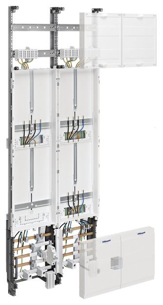 Complete panel, universZ, 1350mm, 3 meter spaces/SG, 2-field, Thuringia version. Meter cabinet solution cabinet housing according to DIN VDE 0603/1, dimensional standard DIN 43 870 for surface-mounted, flush-mounted or partially recessed installation. Consists of a cabinet with door made of powder-coated, baked-in, stably profiled 1 mm thick sheet steel. Interior lining made entirely of plastic. Cable entries at the top and bottom through built-in plastic flange plates. Pre-punched part on the back of the plastic part. Busbar bushings as flanges on both sides that can be opened without tools in the lower area as a way of connecting busbars between different cabinets or in conjunction with a cable junction box and connection set. In addition to the bushing in the NAR, there are also openings in the area of the AAR (for heights of 1100 and 1400 mm) and RfZ (for heights of 1100 mm). Door flush with the front with internal, adjustable hinges, can be opened on the right or left with an opening angle of 110°. Door lock with cam lock. Door lock can be replaced with other locks. Cabinets can be flanged next to each other or one above the other. Cabinet size 1 to 5 fields with 72 to 540 space units (PLE). Note: The main line must be inserted into the lower connection compartment of the meter cabinet from below or from the side and connected there in accordance with VDE-AR-N 4100:2019-04. Height: __ mm (1100mm or 1400mm) Width: __ mm Depth: 205 / 160 mm, RAL color: 9010 Protection type 44, protection class II Nominal current of the busbar system 250 A Design in accordance with VDE-AR-N 4100:2019-04 Meter system for __ meter space(s). According to the technical connection conditions (TAB) of the VNB __ for: __ Electronic household meters (eHZ) or __ meters with 3-point fastening (3HZ). __ for supply systems with normal household consumption max. 63 A (10mm²) according to DIN 18015-1 (__ apartments, __ general, __ reserve, __ heat pump) __ for continuous current applications max. 32 A (10 mm²) according to VDE-AR-N 4100:2019-04 (e.g. PV up to 22 KW) __ for continuous current applications max. 44 A (16 mm²) according to VDE-AR-N 4100:2019-04 (e.g. PV up to 30 KW) __ for meter locations with more than 63 A in intermittent operation or 44 A in continuous operation (transformer measurement) Nominal current _ A, nominal power _ kW __ Tariff ripple control receiver as three-point version alternatively __ Tariff ripple control receiver as top-hat rail version __ Distribution panel (__ PLE), with/without busbars for feeding in __ Distribution panel (__ PLE) with APZ room according to VDE-AR-N 4100:2019-04, with/without busbars for feed-in __ Communication panel, 1- or 2-panel __ Communication panel with APZ room according to VDE-AR-N 4100:2019-04, with/without busbars for feed-in __ SLS switch Hager HTS3xxE in __ A.. Voltage tap for power supply additional devices according to VDE-AR-N 4100:2019-04: __ before the SLS with fuse box pluggable 25 kA __ before the SLS with LS switch 10 A / 25 kA __ behind the SLS with fuse box pluggable 25 kA. Surge protection with combination arrester type 1/2/3 for busbar mounting in the UAR.To comply with the requirements of DIN VDE 0100-443 and -534: ___for TNS/TT network, without external lightning protection, back-up fuse in the HAK - 160 A ___for TNC network, without external lightning protection, back-up fuse in the HAK - 160 A ___for TNS/TT network, with external lightning protection, back-up fuse in the HAK - 160 A ___for TNC network, with external lightning protection, back-up fuse in the HAK - 160 A ___for TNS/TT network, with external lightning protection, back-up fuse in the HAK - 315 A ___for TNC network, with external lightning protection, back-up fuse in the HAK - 315 A Fuse for cellar, washing machine, dryer (if TAB / DIN compliant) per WE (max. 6 PLE) __ pieces of FI/LS switch 10 kA, 16 A, 30 mA (ADA516D). General distribution panel equipped with: __ pcs. LS switch 6 kA, 16 A (MBS116) __ pcs. FI/LS switch 6 kA, 16 A, 30 mA (ADS916D) __ pcs. RCD type 40 A 4-pole, 30 mA (CDS440D). Consisting of: __ pcs. ZB__S, meter cabinet __ pcs. ZK__ Complete panel for __ meters __ selected make/type: HAGER/univers Z or equivalent, supply, install and ready for operation