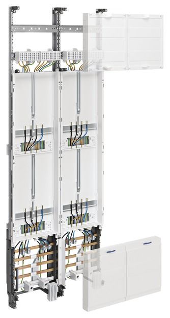 Complete panel, universZ, 1350mm, 4 meter spaces, 2-panel, Bavaria design. Meter cabinet solution cabinet housing in accordance with DIN VDE 0603/1, dimensional standard DIN 43 870 for surface-mounted, flush-mounted or partially recessed installation. Consists of a cabinet with door made of powder-coated, baked-in, stably profiled 1 mm thick sheet steel. Interior lining made entirely of plastic. Cable entries at the top and bottom through built-in plastic flange plates. Pre-punched part on the back of the plastic part. Busbar bushings as flanges on both sides that can be opened without tools in the lower area as a way of connecting busbars between different cabinets or in conjunction with a cable junction box and connection set. In addition to the bushing in the NAR, there are also openings in the area of the AAR (for heights of 1100 and 1400 mm) and RfZ (for heights of 1100 mm). Door flush with the front with internal, adjustable hinges, can be opened on the right or left with an opening angle of 110°. Door lock with cam lock. Door lock can be replaced with other locks. Cabinets can be flanged next to each other or one above the other. Cabinet size 1 to 5 fields with 72 to 540 space units (PLE). Note: The main line must be inserted into the lower connection compartment of the meter cabinet from below or from the side and connected there in accordance with VDE-AR-N 4100:2019-04. Height: __ mm (1100mm or 1400mm) Width: __ mm Depth: 205 / 160 mm, RAL color: 9010 Protection type 44, protection class II Nominal current of the busbar system 250 A Design in accordance with VDE-AR-N 4100:2019-04 Meter system for __ meter space(s). According to the technical connection conditions (TAB) of the VNB __ for: __ Electronic household meters (eHZ) or __ meters with 3-point fastening (3HZ). __ for supply systems with normal household consumption max. 63 A (10mm²) according to DIN 18015-1 (__ apartments, __ general, __ reserve, __ heat pump) __ for continuous current applications max. 32 A (10 mm²) according to VDE-AR-N 4100:2019-04 (e.g. PV up to 22 KW) __ for continuous current applications max. 44 A (16 mm²) according to VDE-AR-N 4100:2019-04 (e.g. PV up to 30 KW) __ for meter locations with more than 63 A in intermittent operation or 44 A in continuous operation (transformer measurement) Nominal current _ A, nominal power _ kW __ Tariff ripple control receiver as three-point version alternatively __ Tariff ripple control receiver as top-hat rail version __ Distribution panel (__ PLE), with/without busbars for feeding in __ Distribution panel (__ PLE) with APZ room according to VDE-AR-N 4100:2019-04, with/without busbars for feed-in __ Communication panel, 1- or 2-panel __ Communication panel with APZ room according to VDE-AR-N 4100:2019-04, with/without busbars for feed-in __ SLS switch Hager HTS3xxE in __ A.. Voltage tap for power supply additional devices according to VDE-AR-N 4100:2019-04: __ before the SLS with fuse box pluggable 25 kA __ before the SLS with LS switch 10 A / 25 kA __ behind the SLS with fuse box pluggable 25 kA. Surge protection with combination arrester type 1/2/3 for busbar mounting in the UAR.To comply with the requirements of DIN VDE 0100-443 and -534: ___for TNS/TT network, without external lightning protection, back-up fuse in the HAK - 160 A ___for TNC network, without external lightning protection, back-up fuse in the HAK - 160 A ___for TNS/TT network, with external lightning protection, back-up fuse in the HAK - 160 A ___for TNC network, with external lightning protection, back-up fuse in the HAK - 160 A ___for TNS/TT network, with external lightning protection, back-up fuse in the HAK - 315 A ___for TNC network, with external lightning protection, back-up fuse in the HAK - 315 A Fuse for cellar, washing machine, dryer (if TAB / DIN compliant) per WE (max. 6 PLE) __ pieces of FI/LS switch 10 kA, 16 A, 30 mA (ADA516D). General distribution panel equipped with: __ pcs. LS switch 6 kA, 16 A (MBS116) __ pcs. FI/LS switch 6 kA, 16 A, 30 mA (ADS916D) __ pcs. RCD type 40 A 4-pole, 30 mA (CDS440D). Consisting of: __ pcs. ZB__S, meter cabinet __ pcs. ZK__ Complete panel for __ meters __ selected make/type: HAGER/univers Z or equivalent, supply, assemble and connect ready for operation