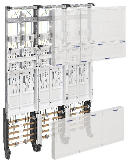 Upper connection compartment: 1-row, height 150 mm with one top hat rail, 2-row, height 300 mm with two top hat rails, equipped with 3-/4- or 5-pole main line branch terminals, finger-safe in accordance with BGVA3 or equipped with __________ __________ ___________ -meter fields with integrated fastening and contacting device (BKE-I) for eHZ, for installation in accordance with DIN 43870, eHZ meter support plate with integrated additional space (for communication and control devices).