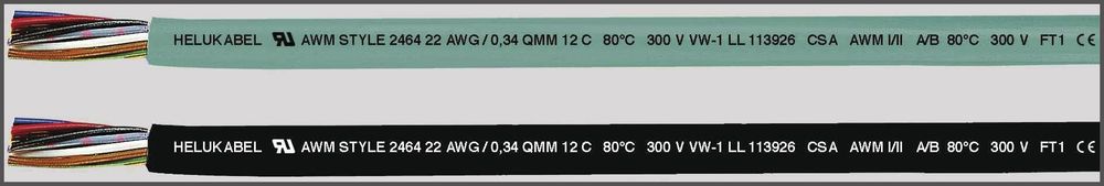Special PVC control cable approved according to UL Style 2464, cores for AWG 26-20 in accordance with UL Style 1061/1729 for AWG 18-16 in accordance with UL Style 1007/1569Temperature range moving -10°C to +80°C fixed -20°C to +80°C