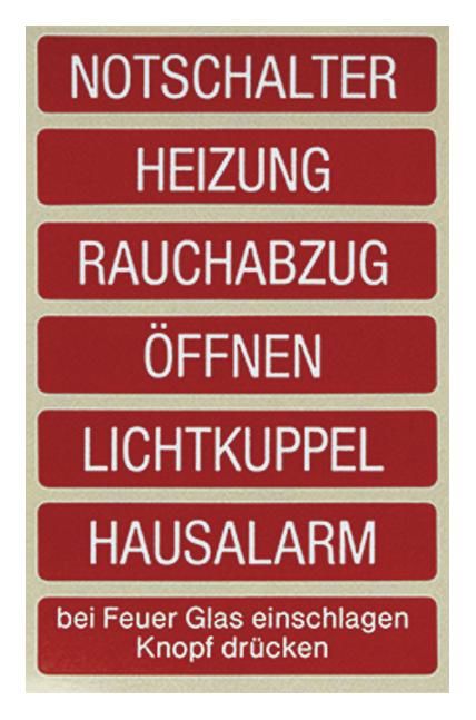 With label 'Open smoke extractor, house alarm, heating emergency switch, emergency switch, break window in case of fire? Press button'.