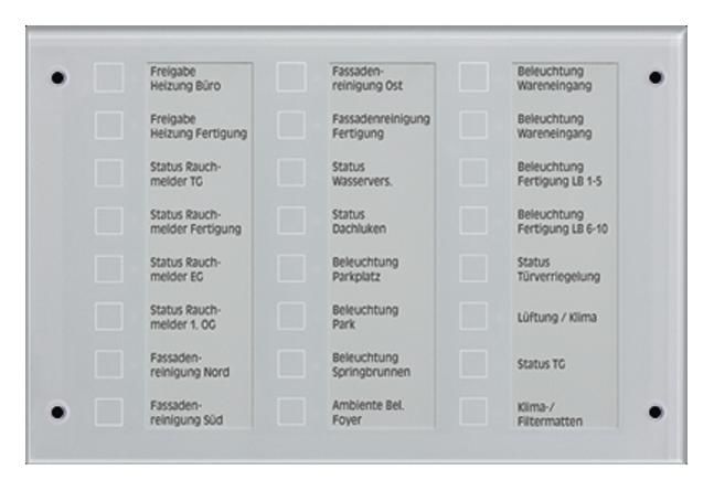 The panel with aluminum housing and high-quality glass front has 24 independent capacitive sensor buttons and 24 RGB LEDs for status display, which can be labeled using foil strips.