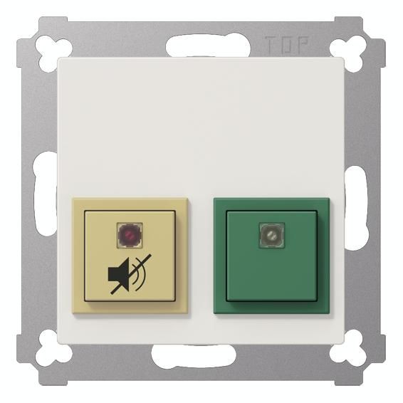The duty room unit can be installed in addition to the components of the emergency call set, e.g. in a staff room or reception room. A green button indicates presence, a yellow button suppresses the acoustic emergency call signal of the call module for 20 seconds.