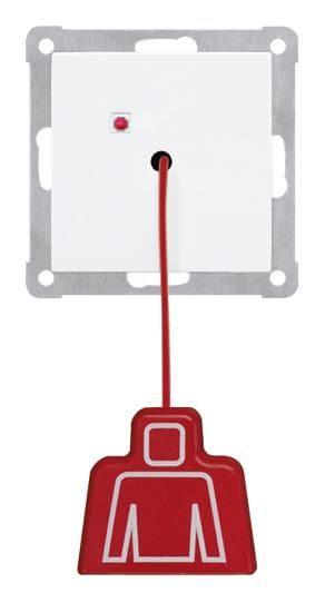 An emergency call can be triggered in the bathroom/toilet via an easily accessible pull cord. The pull button can also be installed on the ceiling in the middle of the room so that it is easily accessible for people in need of help. A successful call is signaled by a red reassurance lamp on the button.
