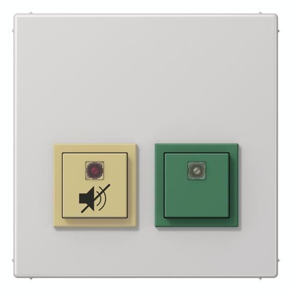 The duty room unit can be installed in addition to the components of the emergency call set, e.g. in a staff room or reception room. A green button indicates presence, a yellow button suppresses the acoustic emergency call signal of the call module for 20 seconds.