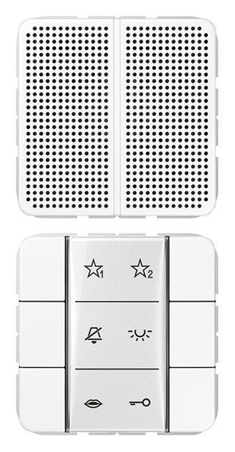 Light, call silencing and the two function buttons are freely configurable. Button functions can be triggered without additional installation, e.g. for internal telephony, triggering of switching/control functions in conjunction with Siedle bus switching module BSM/BSE 650-.., targeted selection of door loudspeakers (outdoor stations)