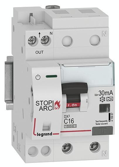 Legrand fire protection switch DX3 STOP ARC. According to EN 62606, VDE 0665-10, EN 61009-1, VDE 0664-20. AFDD with FI/LS switch, 1-pole with switching neutral conductor, type A for alternating and pulsating direct residual currents, undelayed, rated residual current Idn 30 mA, surge current resistant up to 250 A. LS circuit breaker part: C characteristic, rated current In 16 A, rated switching capacity Icn 10 kA in accordance with EN 61009-1, rated voltage Un 230 VAC, rated frequency 50 Hz, energy limitation class 3, fastening on top hat rail EN 60715 using snap-in fastenings, clear information on the front of each device, clear switch position indicator red/green on the switch lever, with label window, neutral conductor connection on the right, can be mounted using Legrand fork comb rails. Auxiliary devices can be attached. Tripping indicator: yellow = residual current or test button tripping, colorless = short circuit or manual tripping. The DX3 STOP ARC fire protection switch is a device combination of an AFDD arc fault protection device with a residual current circuit breaker and a miniature circuit breaker. The single-pole protected and double-pole switched AFDD with FI/LS switch offers safe all-pole shutdown in the event of the following faults: residual current to earth, overload, short circuit, parallel and serial arc faults. With LED status display for identifying the operating status, signal display for visual detection when an arc fault is triggered. The AFDD unit monitors itself using an internal daily self-test. Causes of arc faults include: damaged conductor insulation caused by nails, screws or holes, crushed cables or lines, loose or faulty terminals in sockets or screw connections.