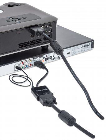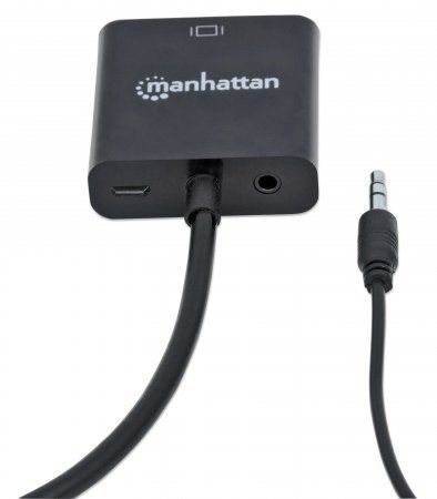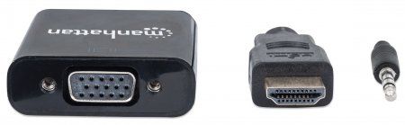 The MANHATTAN HDMI to VGA converter enables the connection of a PC, notebook or other media device with HDMI port to a monitor or projector with a VGA port. So you can still use older displays with modern HDMI devices. The additionally included audio connection with jacks can be output to an external device via the converter and audio. - Converts a digital HDMI signal into analog VGA video to audio output integrated