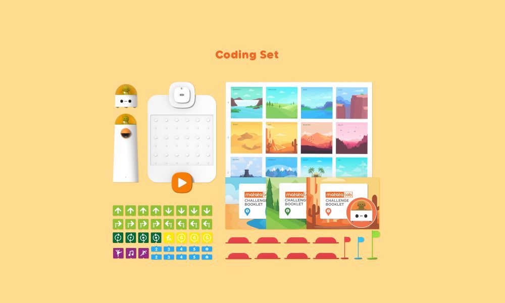 - without a display, cell phone, tablet. The MatataLab Coding Set enables children aged 4-9 years to program with a small robot. You will autodidactically learn fundamental coding skills and develop the cognitive skills necessary to understand abstract and complex rules and chains. Since the robot is programmed using small blocks, which are photographed from a coding tower" on the input board, no screen, cell phone, tablet, computer or similar is required. The system is ideal for use in kindergarten and primary school. There is even a German curriculum book available for you! Contents of the MatataLab Coding Set1x MatataBot robot 1x control tower 1x programming board 4x "straight ahead" block 4x "backwards" block 4x "left rotation 90°" block 4x "right rotation 90°" block 2x "loop starts" block 2x "turn right 90°" block Loop ends" 1x "Function Definition" block 1x "Function recall" block 1x "Songs" block 1x "Dance" block 1x "Movement" block 2x number "5,1 cm ( 2 inch ) 2x number "7,6 cm ( 3 inch ) 2x number "10,2 cm ( 4 inch ) 2x number "12,7 cm ( 5 inch ) 2x number "random" 1x folder "Nature 3x booklet with tasks 8x obstacles 3x flags 1x USB-C cable