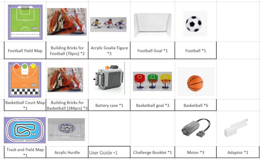 Kit contents: Football field *1 Football blocks (76pcs) *2 Goalkeeper figure *3 Football goal *1 Football *1 Basketball court plan *1 Basketball blocks (284pcs) *3 Battery holder *1 Basketball hoop *3 Basketball *6 Athletics map *1 Acrylic hurdle *1 Motor *3 Adapter *2 Activity book *1 User manual *1