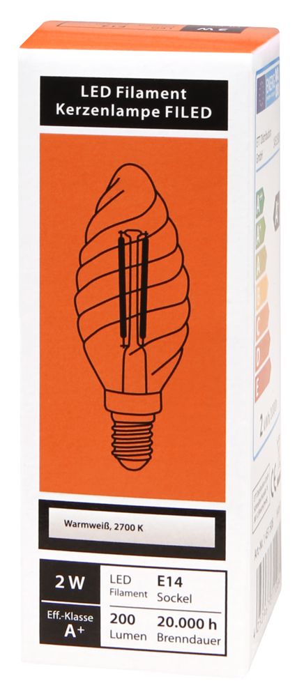 In addition, you can save money with our attractive graduation prizes with every purchase. If you buy a minimum of 50 pieces of LED filament candle lamp twisted McShine ''Filed'', E14, 2W, 200 lm, warm white, clear we can offer you a price of 2,69 EUR per piece. The more you buy, the cheaper the article will be.