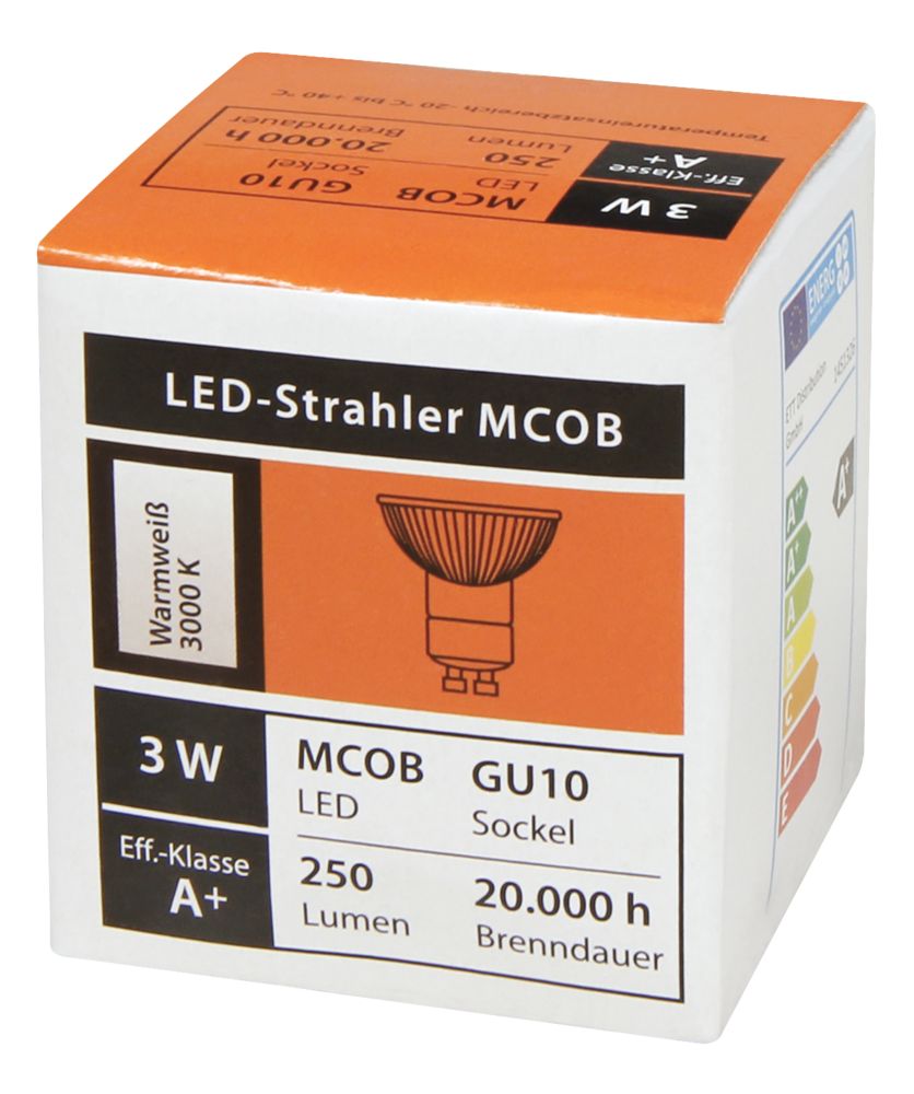 The article McShine ''MCOB'' GU10 LED spotlight, 3W, 250 lm, warm white, pack of 10 is currently in stock